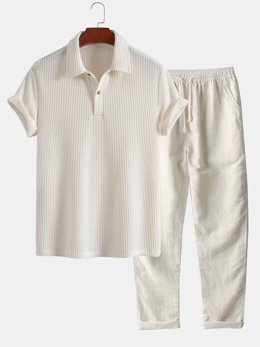 Polo de manga corta con diseño de gofre y pantalones de lino de pierna recta