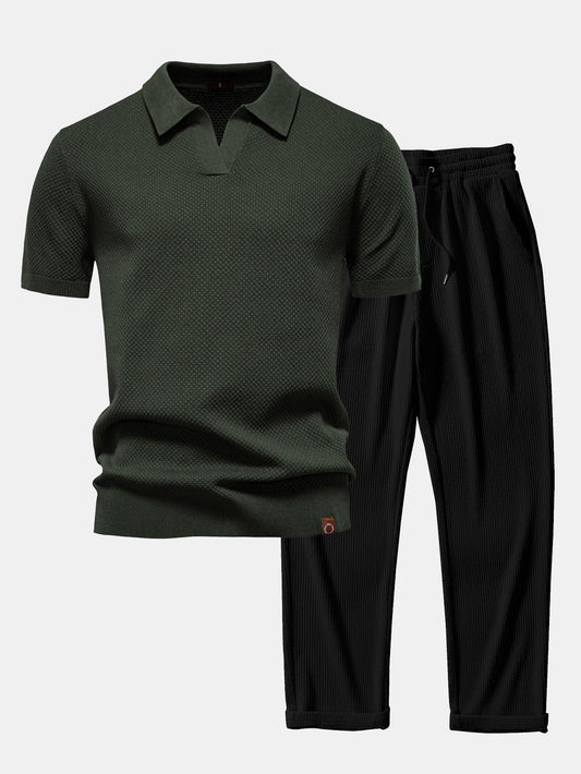 Polo de punto con textura de piña y cuello en V y pantalones rectos acanalados