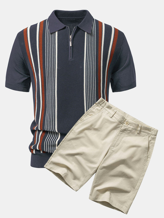 Polo de punto a rayas con cremallera y pantalones cortos chinos de algodón