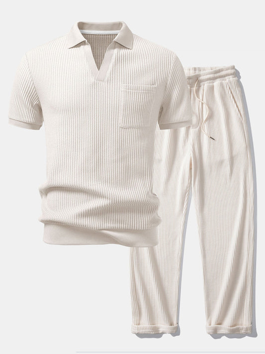 Polo de cuello waffle Johnny con bolsillo y pantalones de punto waffle con cordón ajustable