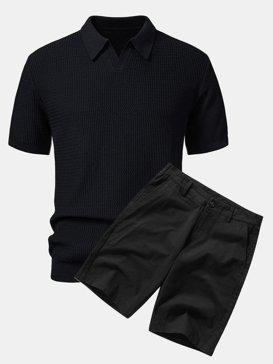 Polo de punto jacquard ondulado con cuello en V y pantalones cortos chinos de algodón