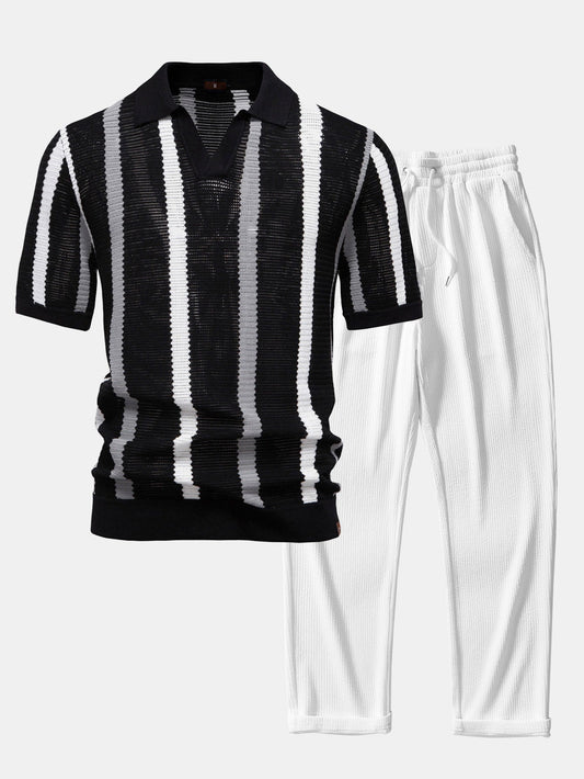 Polo de punto a rayas con cuello en V y pantalones rectos acanalados