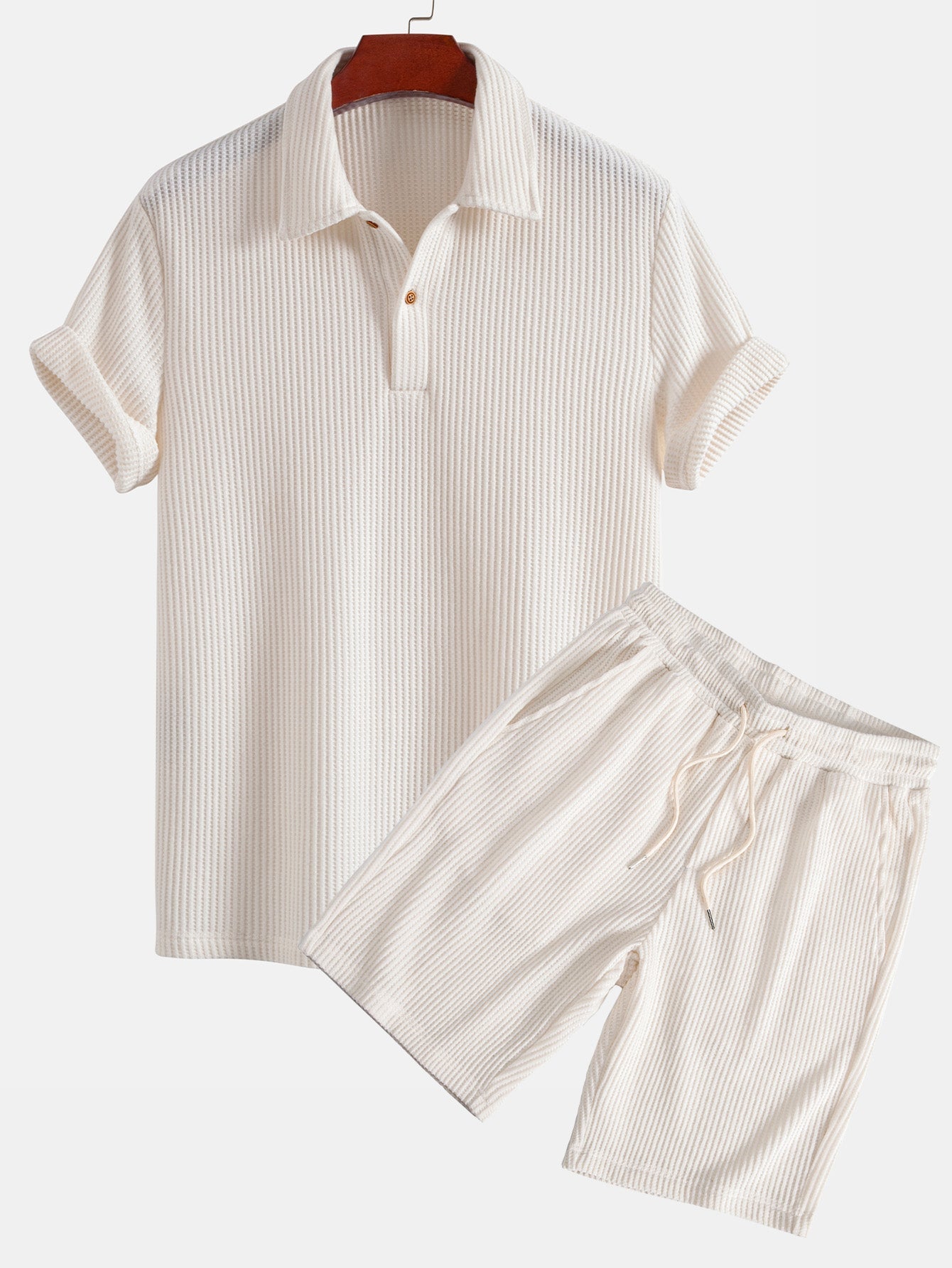 La comodidad natural se combina con un estilo limpio e informal en este conjunto coordinado de punto gofre. Con un polo de manga corta y pantalones cortos con cordón a juego, este dúo está confeccionado en tejido gofre texturizado, transpirable, ligero y ultrasuave.