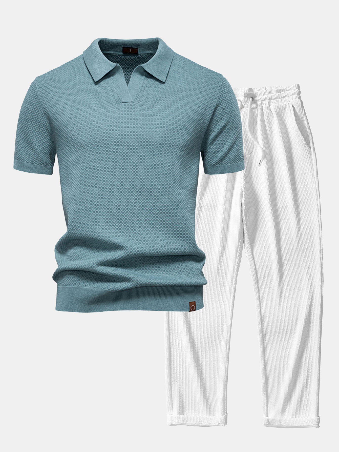El polo luce una distintiva textura de punto de piña que le aporta una sutil dimensión y un atractivo visual, combinada con un clásico cuello en V que le da un toque moderno. Complementado con elegantes pantalones rectos acanalados, este dúo ofrece el equilibrio perfecto entre comodidad y sofisticación discreta, ideal para un estilo informal o para un uso diario refinado.